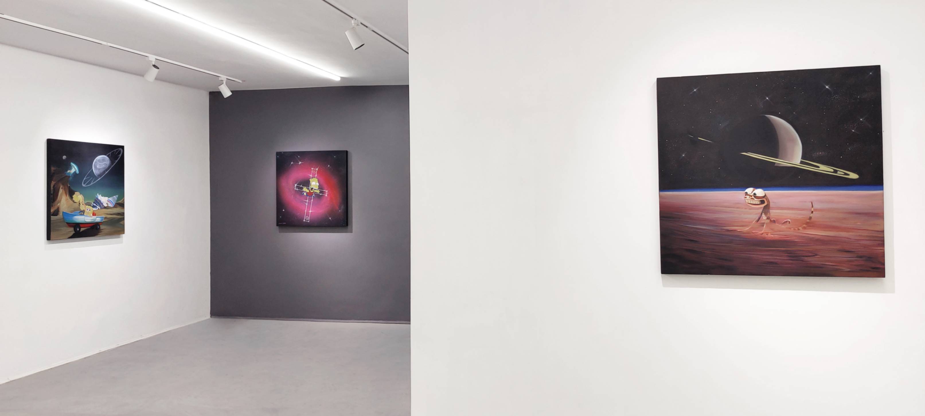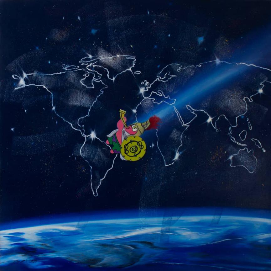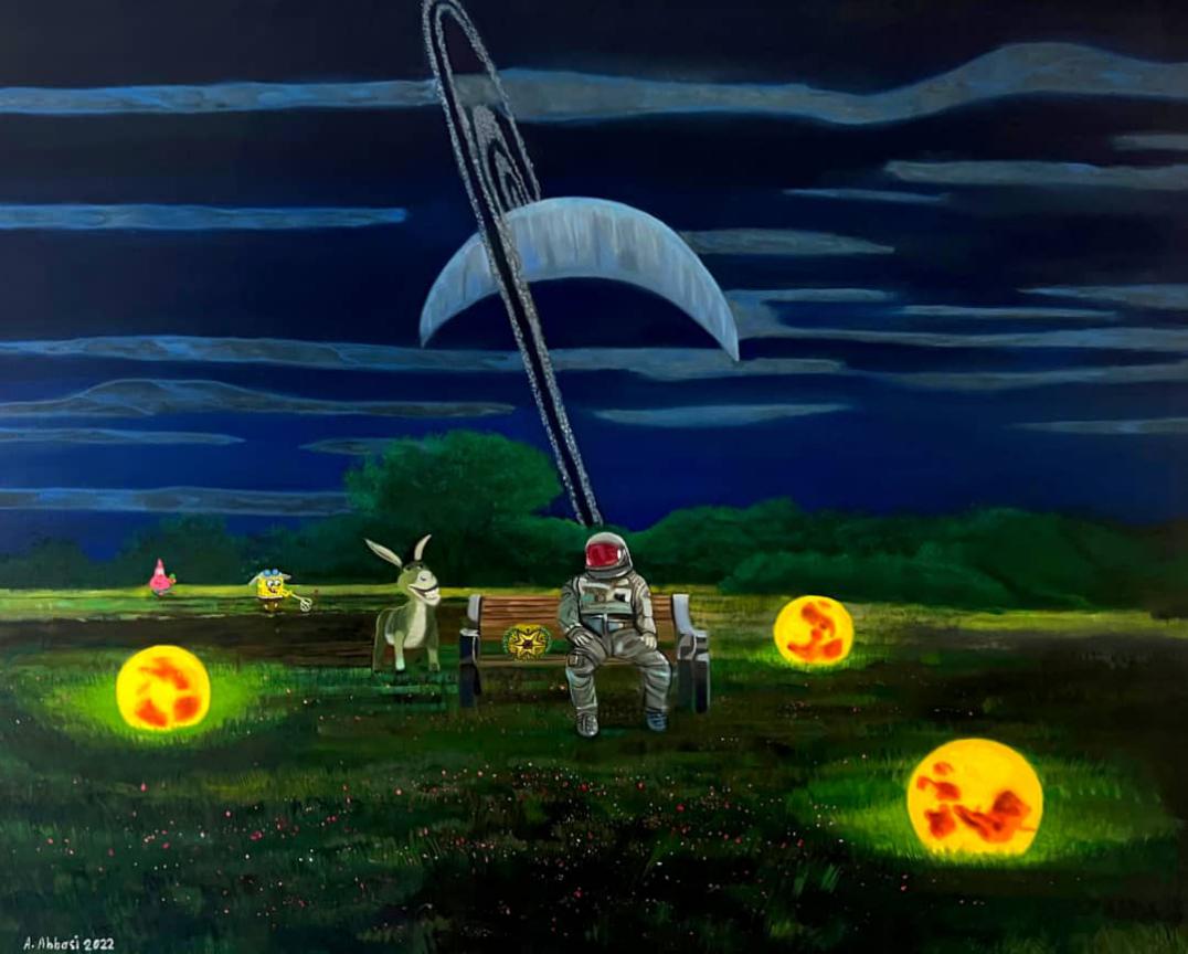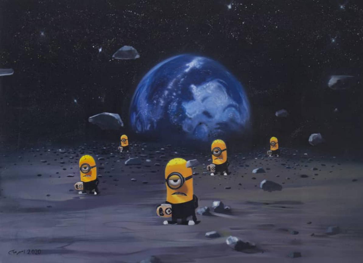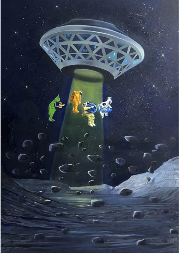 52 Hertz Station We have always wanted to escape the loneliness in the universe despite the advances in astronomy. However, our voice in the vastness of space is too faint and ineffective to be heard. Time in the universe is expanding at such a speed that everything within it quickly fades and disappears. In 1952, a whale was observed in the ocean emitting a sound at a frequency of 52 Hz, unable to hear or communicate with other whales. This was because it should have been able to produce and hear sounds in the range of 10 to 35 Hz. This whale became known as the loneliest whale in the world. In my dream, this event might suggest the existence of beings in the universe who have differences in connecting with us humans. This empathy and, at the same time, confusion, for me in the world of cartoon images and animation—where possibilities for inspiration and imagination are greatly amplified—has become the foundation for creating pieces inspired by paintings and sculptures related to my humorous interpretation of existence. A fanciful prediction of a fictional reality, presented in a humorous format with cartoon characters that could gently accompany us through the loneliness of the universe.
