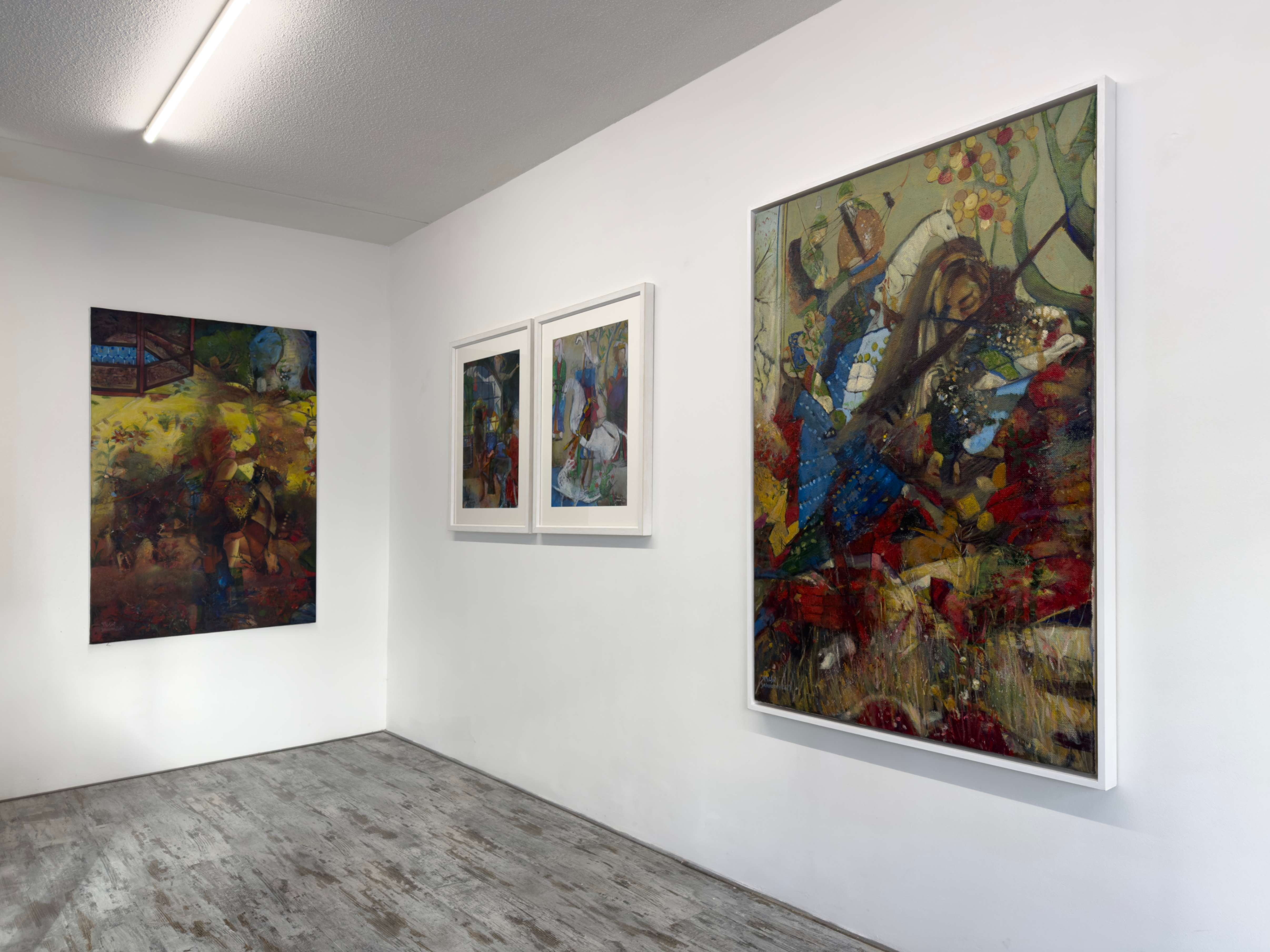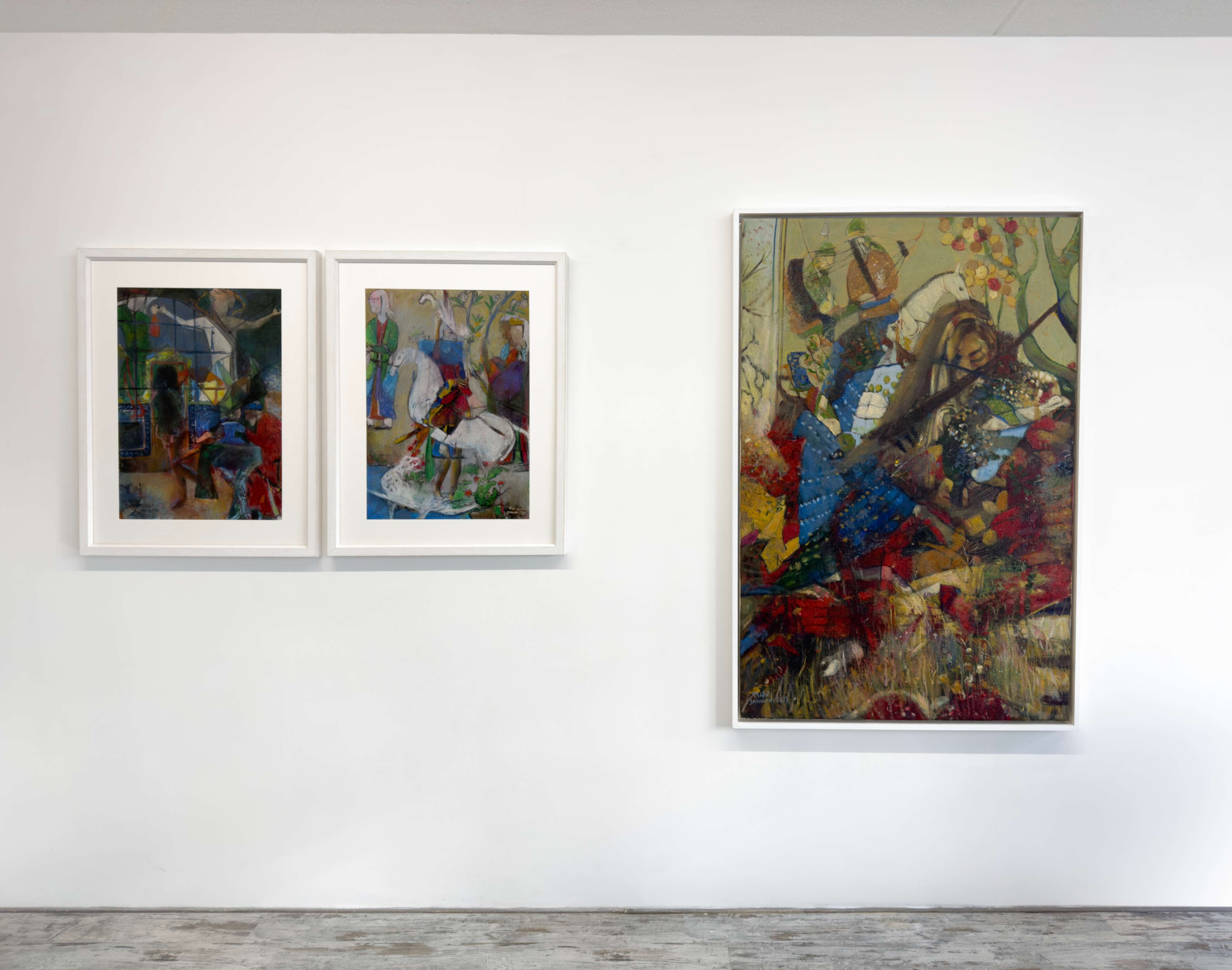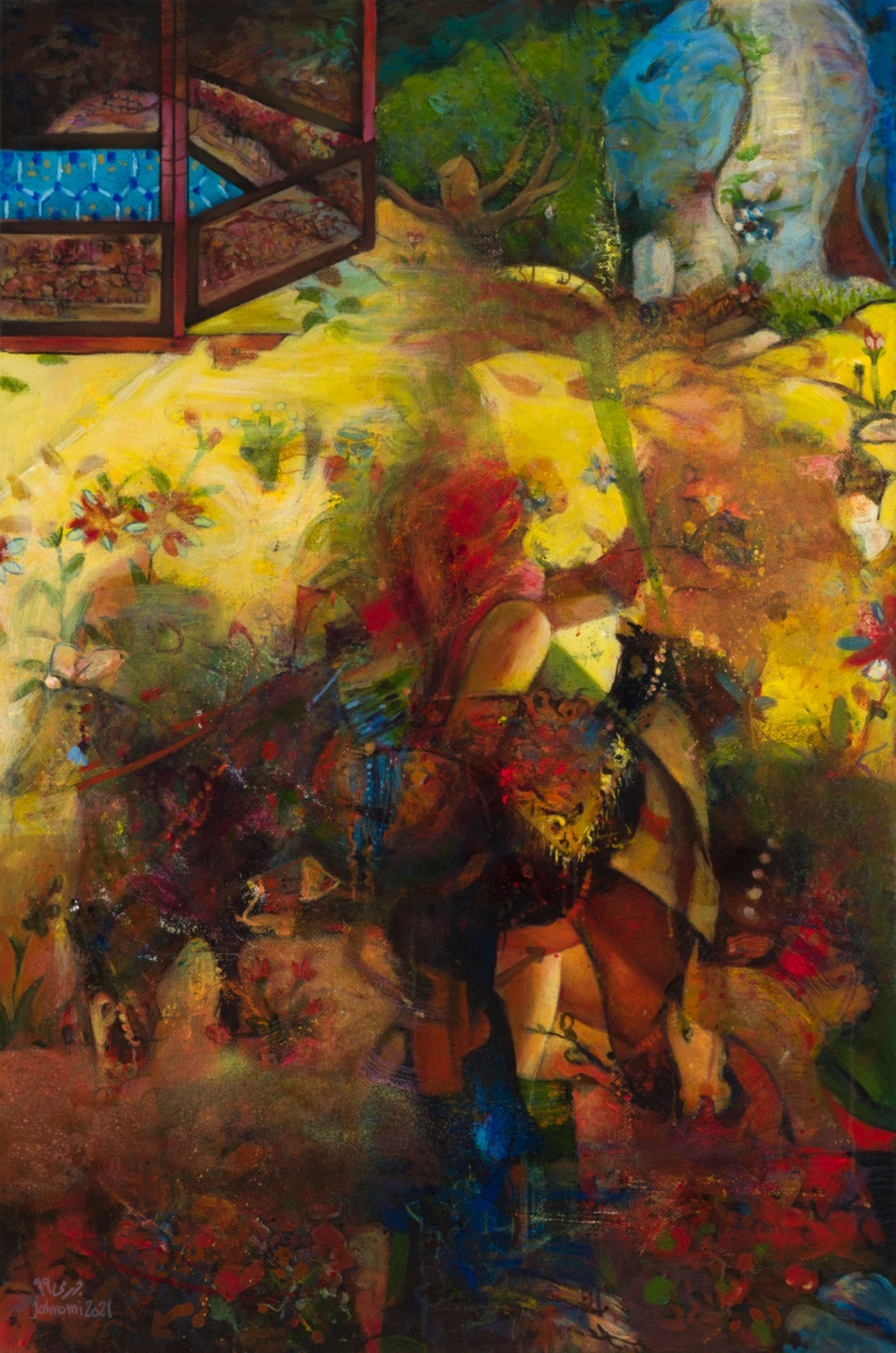 “ORIENTAL WARMTH” In the “Oriental Warmth” series, the past and present intertwine. Forms and colors emerge from the depths of Persian miniatures, yet the narratives are no longer the same. Amidst layers of color, the woman—sometimes concealed, sometimes revealed—struggles to transcend boundaries and limitations. In most ancient miniatures, women were not the focal point of depiction. However, in “Oriental Warmth,” men are pushed to the periphery, while the woman becomes a fluid force—present in the battlefields, in the silence of old houses, in mirrors that reflect the truth. Fragmented at times, brimming with the vibrancy of life at others, yet always in motion, in transformation, reclaiming her place. The interwoven layers of these paintings resemble voices that seep through walls—unstoppable, uncontainable. “Oriental Warmth” is a narrative of presence, breaking barriers, and reclaiming lost spaces. These paintings tell the story of women who defy imposed boundaries, reclaim their rightful place, and redefine the world anew.