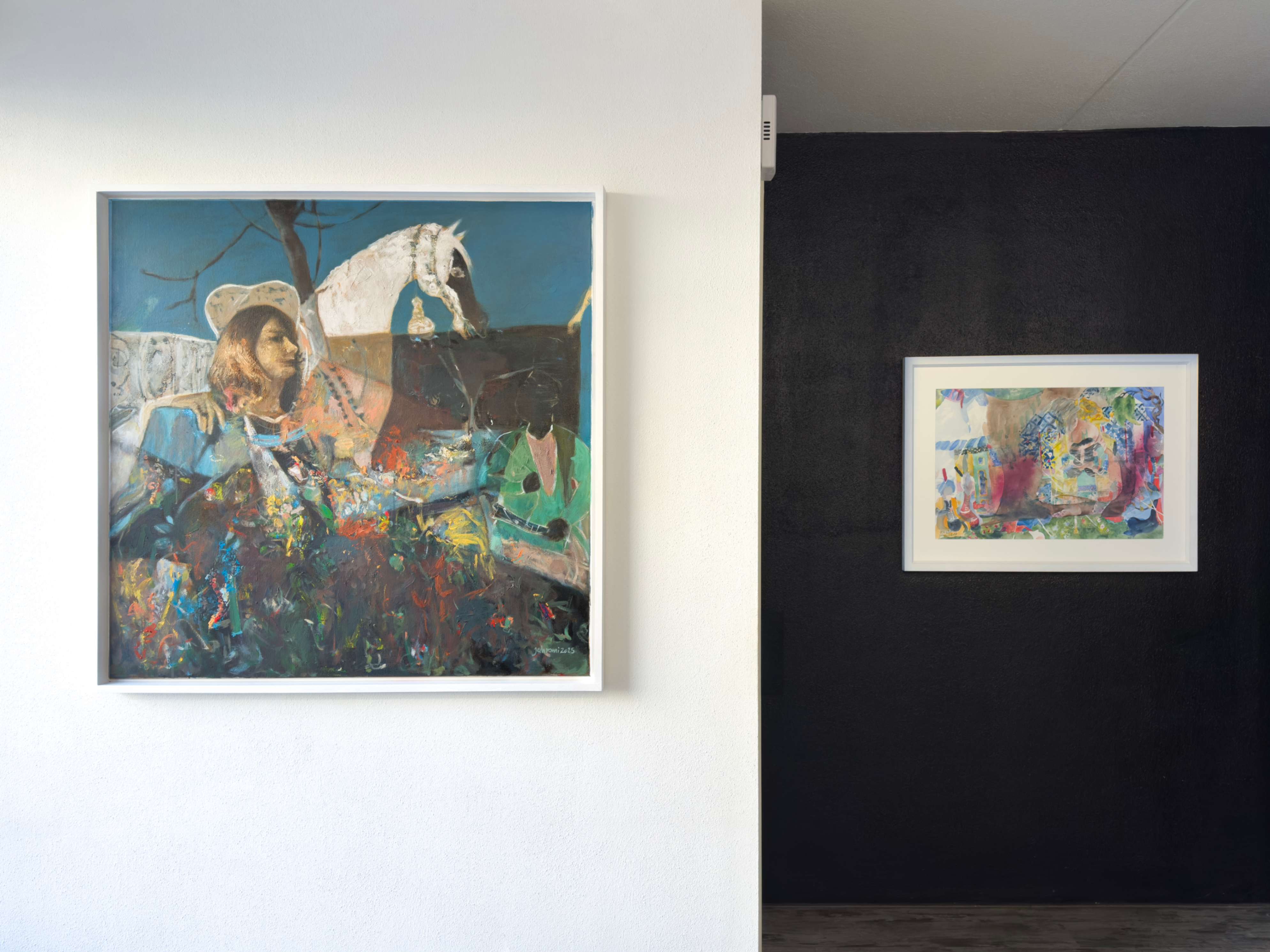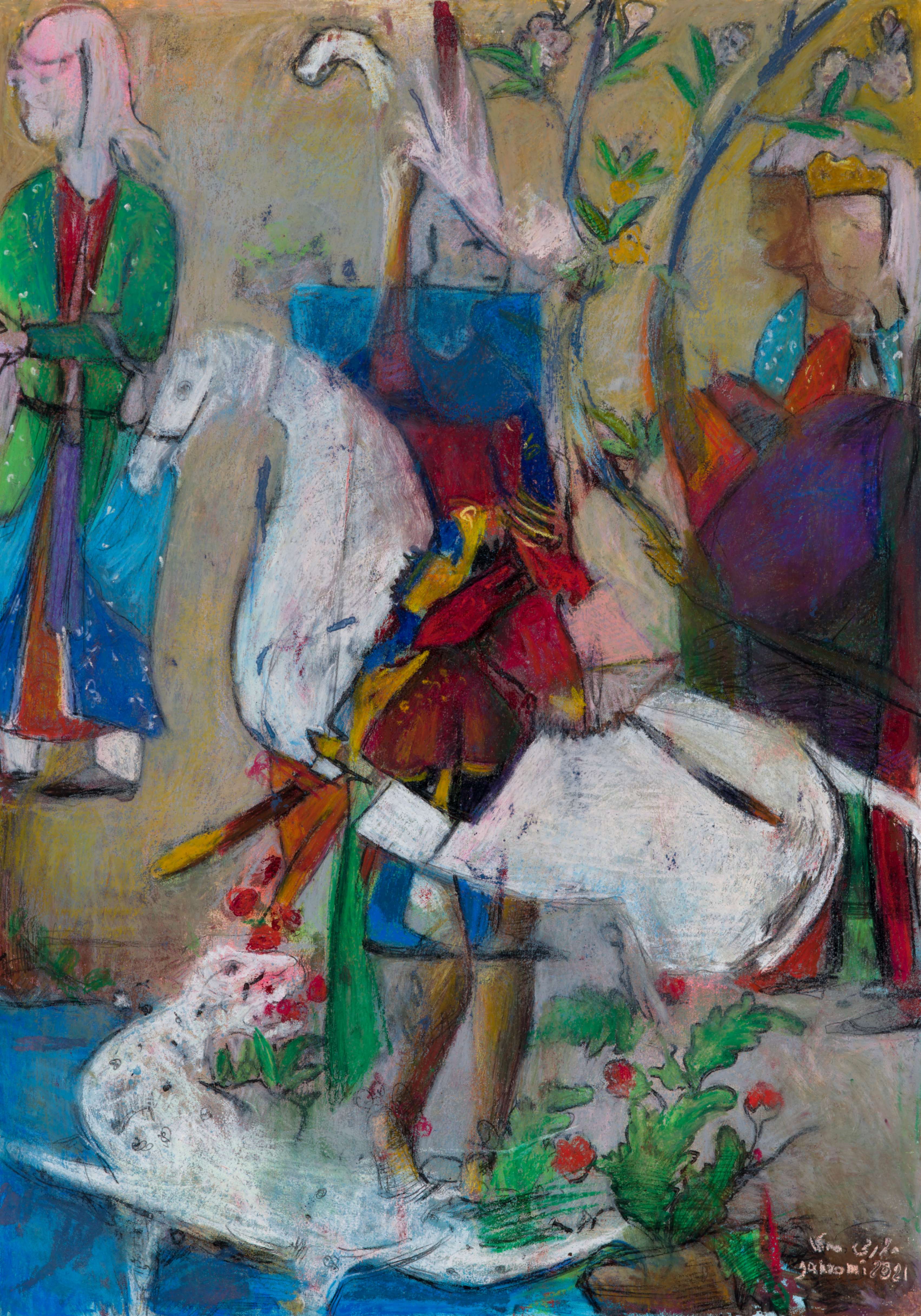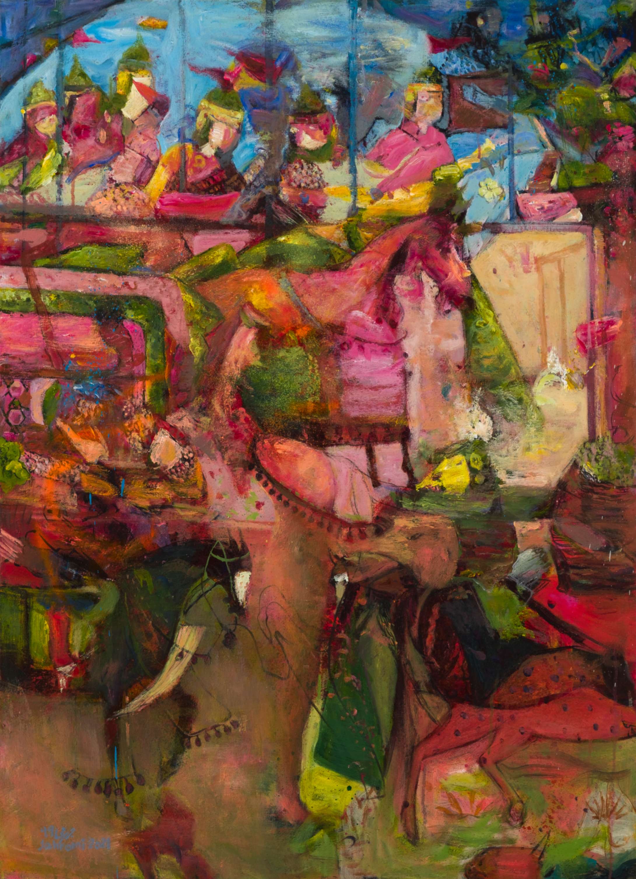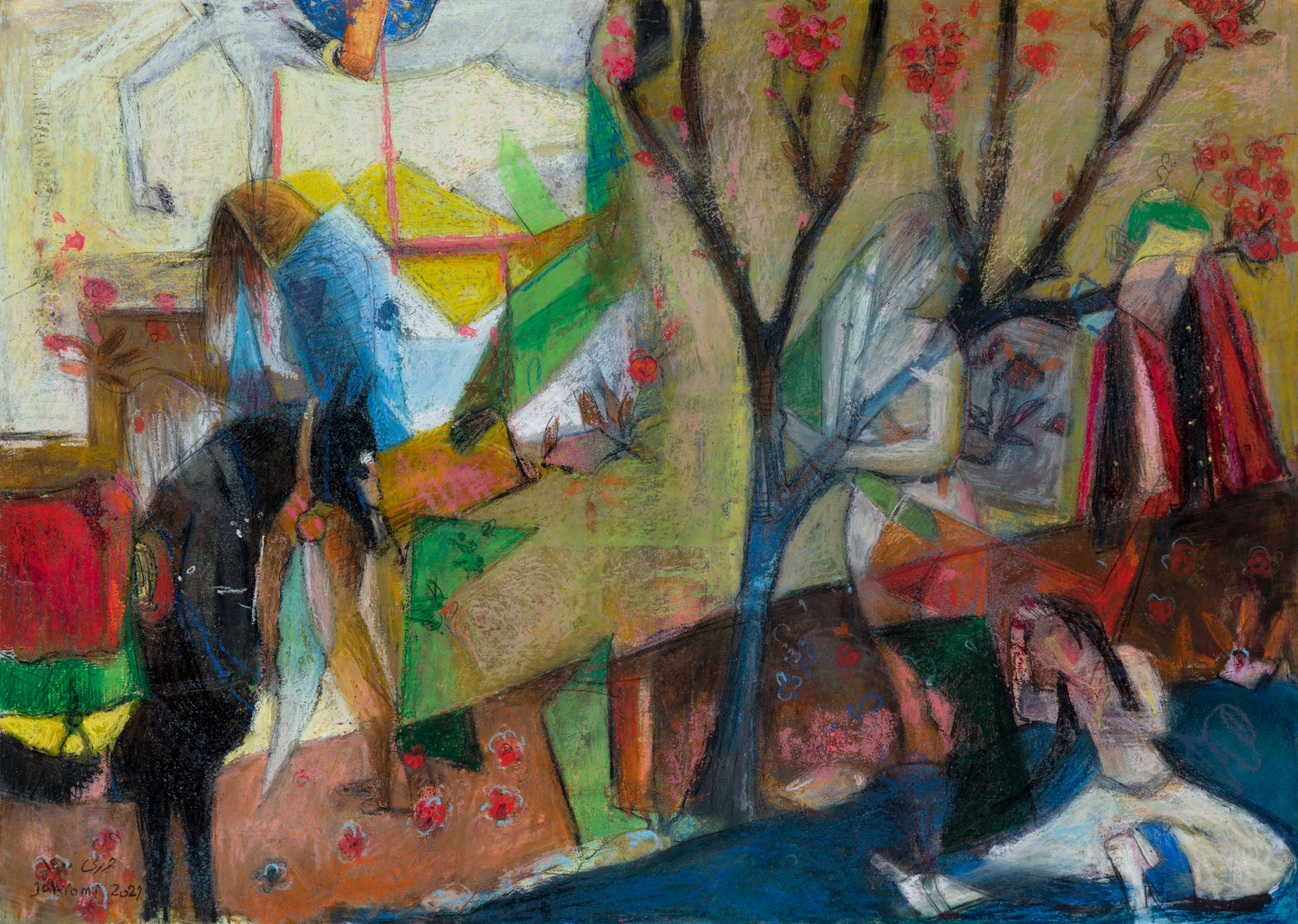 “ORIENTAL WARMTH” In the “Oriental Warmth” series, the past and present intertwine. Forms and colors emerge from the depths of Persian miniatures, yet the narratives are no longer the same. Amidst layers of color, the woman—sometimes concealed, sometimes revealed—struggles to transcend boundaries and limitations. In most ancient miniatures, women were not the focal point of depiction. However, in “Oriental Warmth,” men are pushed to the periphery, while the woman becomes a fluid force—present in the battlefields, in the silence of old houses, in mirrors that reflect the truth. Fragmented at times, brimming with the vibrancy of life at others, yet always in motion, in transformation, reclaiming her place. The interwoven layers of these paintings resemble voices that seep through walls—unstoppable, uncontainable. “Oriental Warmth” is a narrative of presence, breaking barriers, and reclaiming lost spaces. These paintings tell the story of women who defy imposed boundaries, reclaim their rightful place, and redefine the world anew.