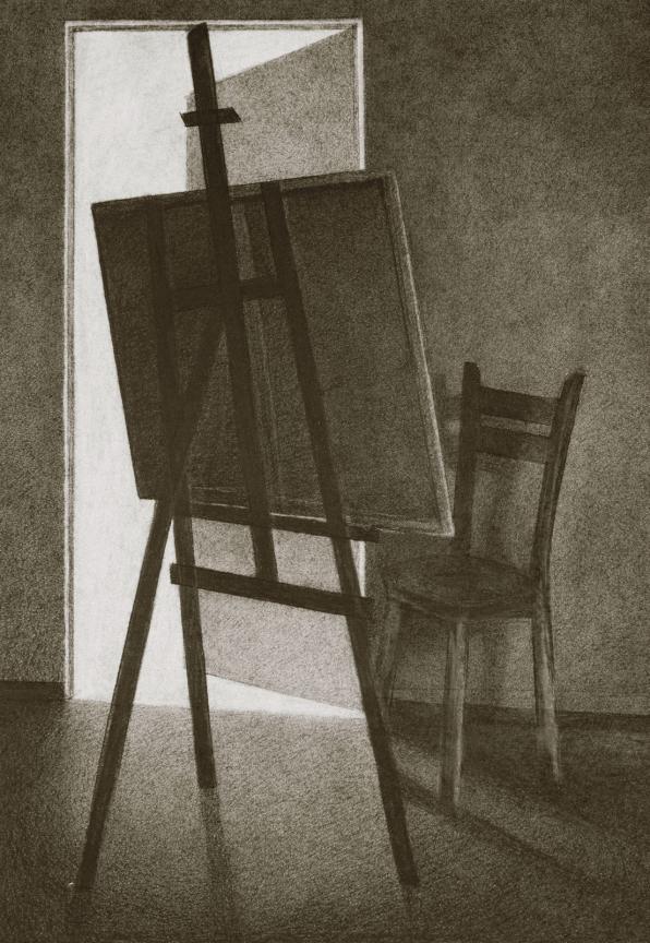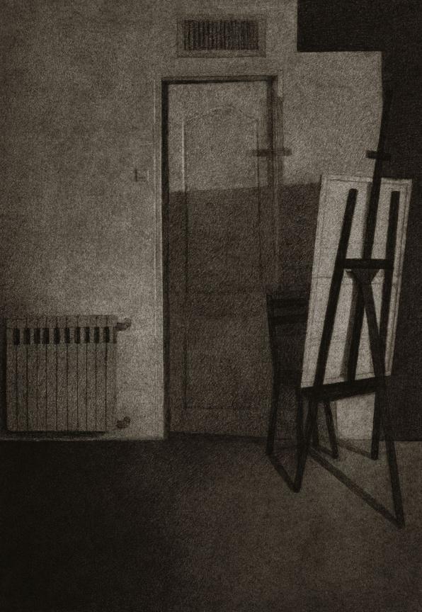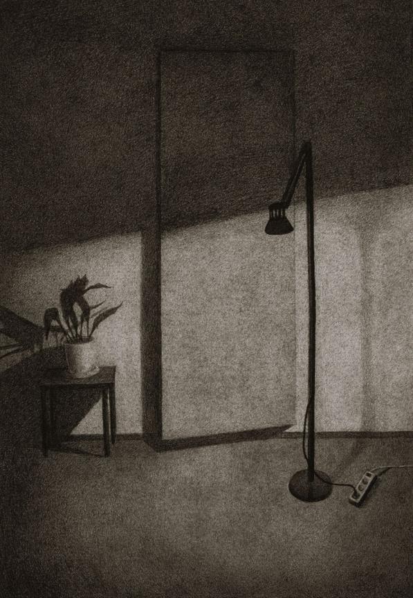 Silence and Tranquility The house, its walls, and the objects enclosed within them have become the subjects of my drawings. The soft textures of fabrics alongside the rough textures of tables and chairs mirror the contrasting emotions and feelings I have experienced within these walls. In “Silence and Tranquility”, through the gray tonalities of charcoal, I aim to represent place-based experiences. “Silence and Tranquility” captures fleeting moments of light and shadow that bring the house to life. The movement of light across silent, motionless objects reflects an eerie calm within, contrasted with the frenzied tension outside. For me, this represents the encounter between self and other, light and shadow, past and future, interior and exterior.