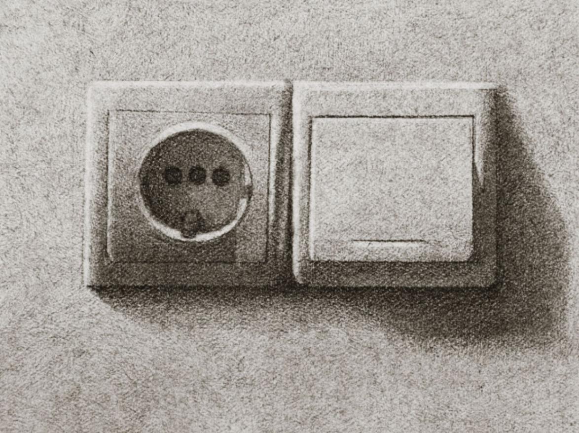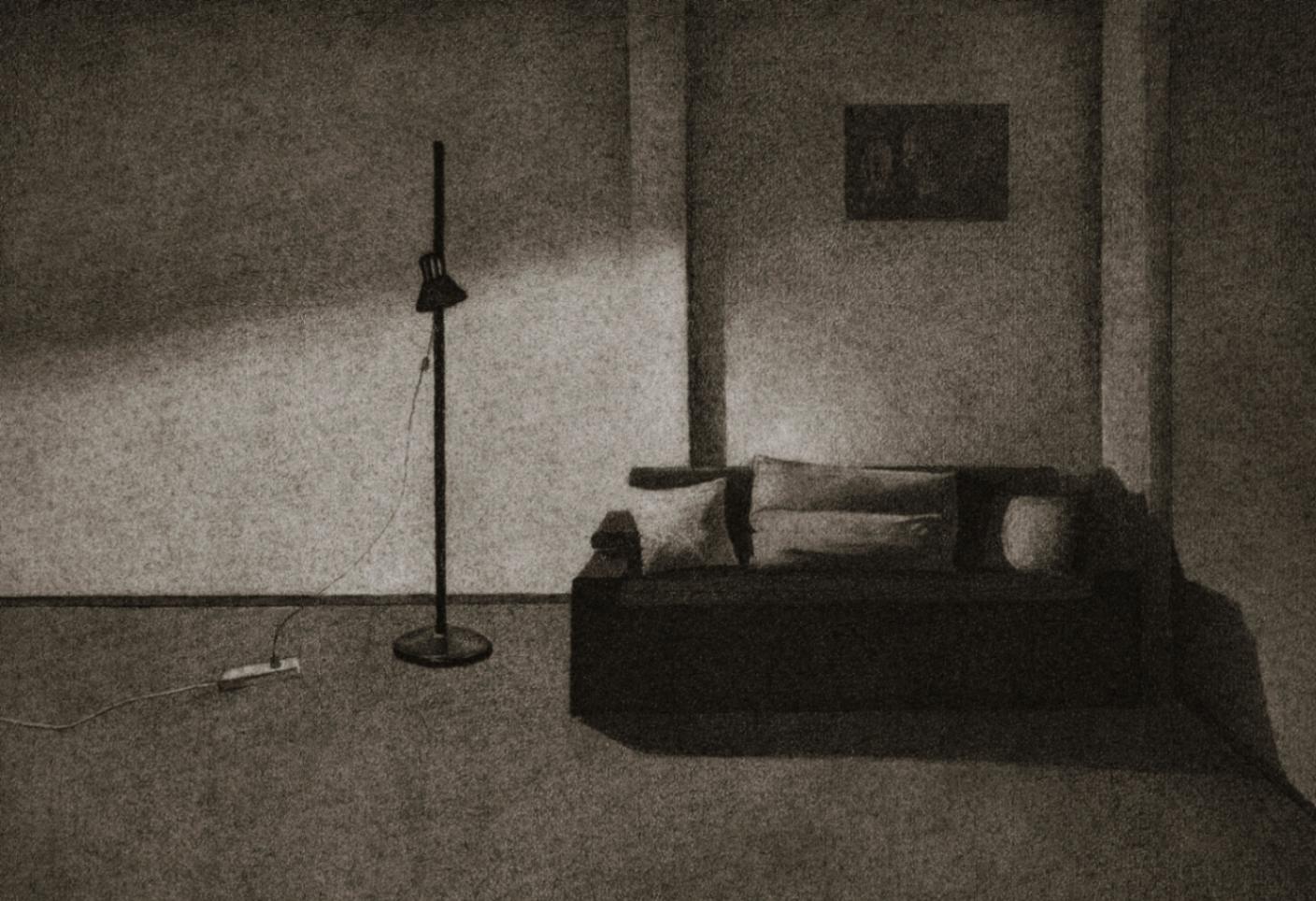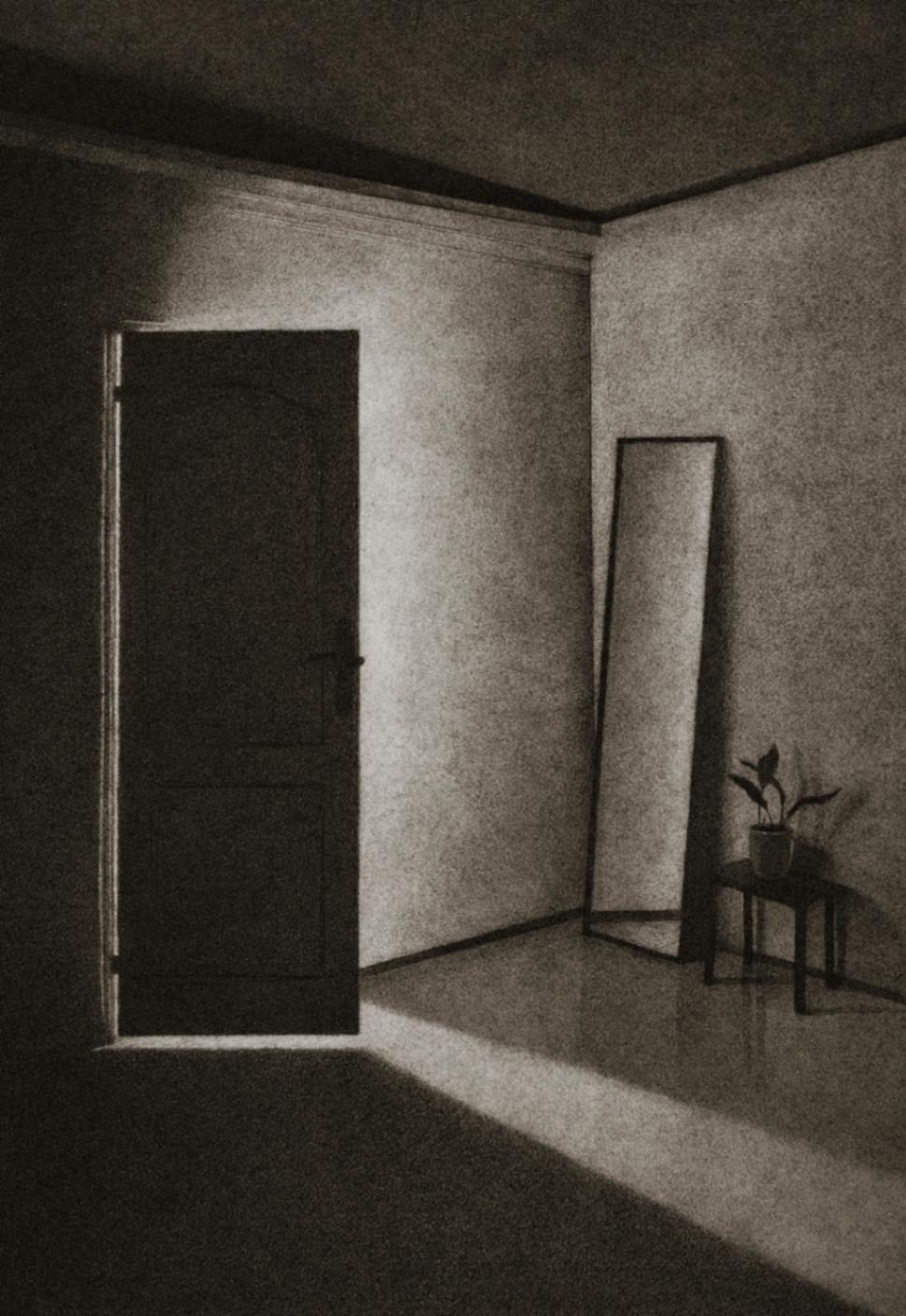 Silence and Tranquility The house, its walls, and the objects enclosed within them have become the subjects of my drawings. The soft textures of fabrics alongside the rough textures of tables and chairs mirror the contrasting emotions and feelings I have experienced within these walls. In “Silence and Tranquility”, through the gray tonalities of charcoal, I aim to represent place-based experiences. “Silence and Tranquility” captures fleeting moments of light and shadow that bring the house to life. The movement of light across silent, motionless objects reflects an eerie calm within, contrasted with the frenzied tension outside. For me, this represents the encounter between self and other, light and shadow, past and future, interior and exterior.