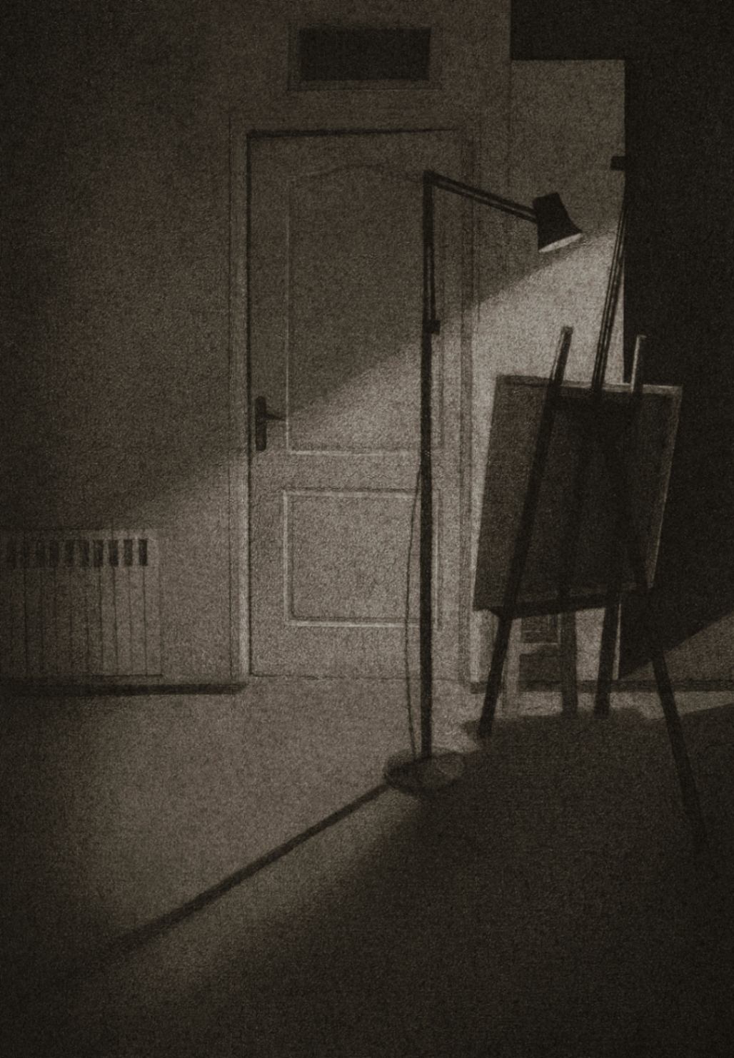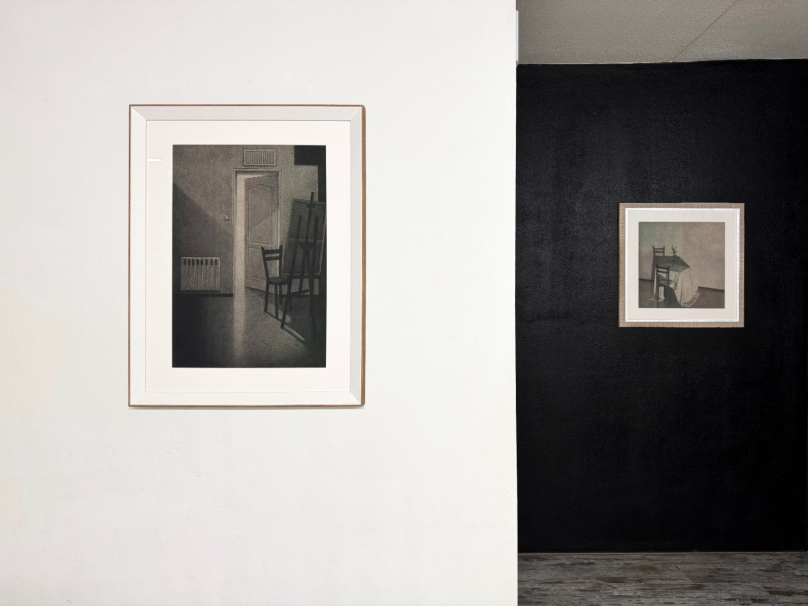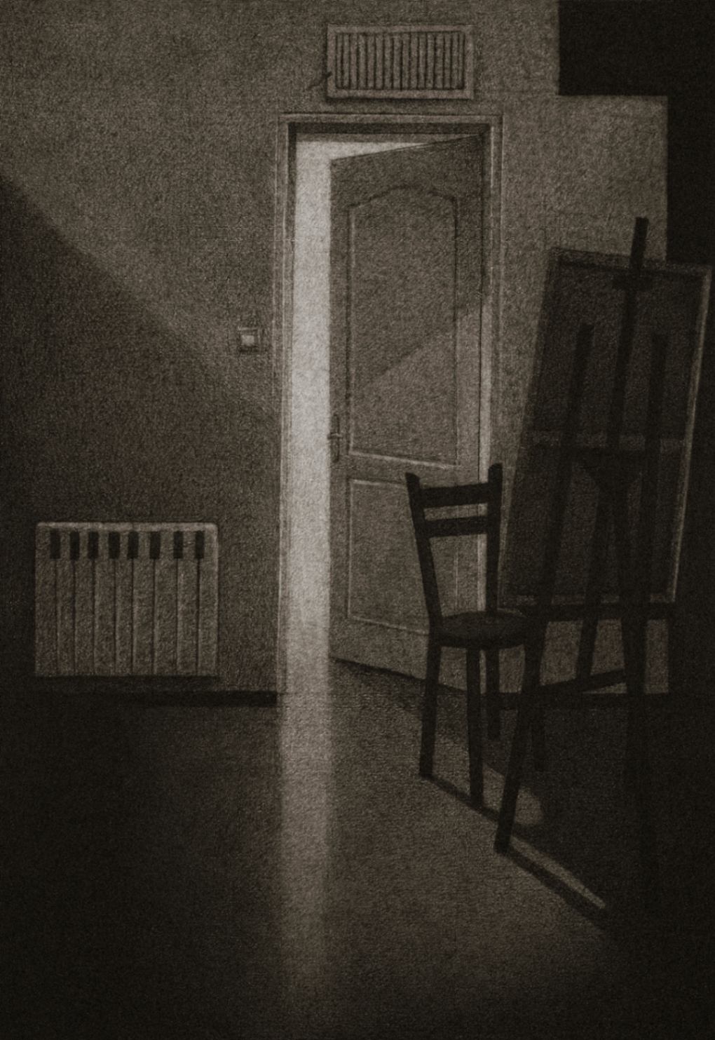 Silence and Tranquility The house, its walls, and the objects enclosed within them have become the subjects of my drawings. The soft textures of fabrics alongside the rough textures of tables and chairs mirror the contrasting emotions and feelings I have experienced within these walls. In “Silence and Tranquility”, through the gray tonalities of charcoal, I aim to represent place-based experiences. “Silence and Tranquility” captures fleeting moments of light and shadow that bring the house to life. The movement of light across silent, motionless objects reflects an eerie calm within, contrasted with the frenzied tension outside. For me, this represents the encounter between self and other, light and shadow, past and future, interior and exterior.