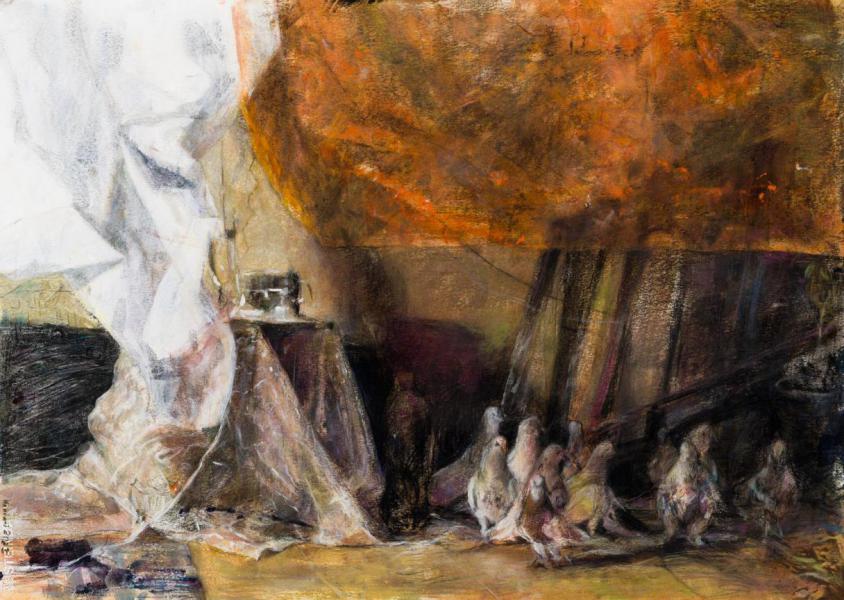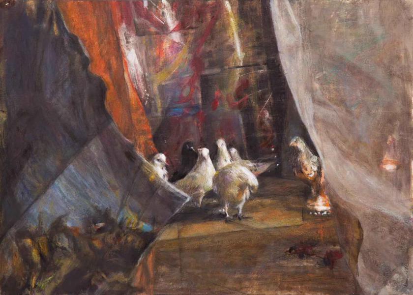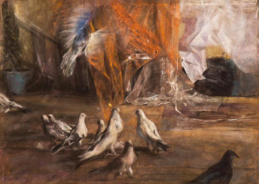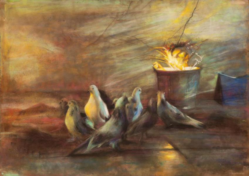 We Are The presence of pigeons in the city where I live is prominent. Sometimes I wonder which of their movements are intentional and which are beyond their control. These pigeons were domesticated by humans long ago and have since been left to their own devices over time. Now it seems that they can no longer live according to their natural instinct, nor have they adapted to the new order of life; they belong to neither of these conditions. The similarity between the life of these pigeons and the lives of humans in our own society is what led me to choose this subject. The more I explored, the more similarities I saw, and I became more determined in my choice of subject. In the time between creating my previous collection and this one, I have witnessed many changes in my surroundings, which have found their way into my work. Through my interactions with the pigeons, I realized that they only begin to move when light is cast upon them. In “We Are” I am the director who makes the pigeons move by casting light or creating darkness.